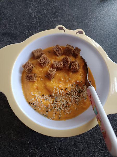 Apviriau kelis šonkauliukus, nugreibiau putas, tada dėjau pjaustytą bulvę, svogūno laiškų, žiupsnį druskos ir čiut pipirų. Paviriau 15min, sudėjau tarkuoto burokėlio ir dar 5min. Išjungus dar palikau pabūti. Man atrodo aš šonkaulius jai kasdien duosiu vis kitam pavidale 😁