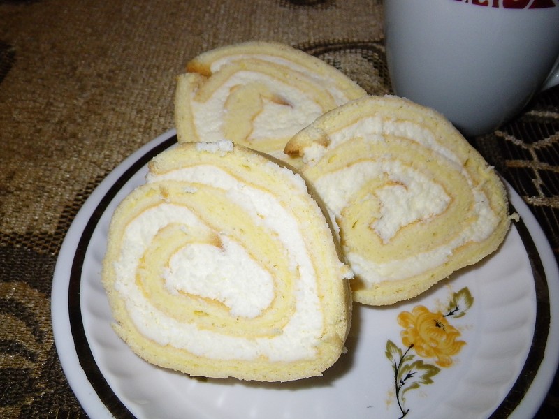 Biskvitas. Kiaušinių trynius išplakti su cukrumi iki purumo. Sudėti miltus, gerai išmaišyti. Iki standumo išplakti baltymus ir sudėti į trynių masę. Tinkamai išplaktų baltymų paviršius yra lygus, blizgantis, ne porėtas, ir apvertus dubenį baltymai turi laikytis jame, neslysti, nekeisti padėties! Labai atsargiai šaukštu išmaišyti tešlą iki vientisos masės. Tešla turi būti puri, nesukritusi. Pilti tešlą ant kepimo popieriumi išklotos orkaitės skardos (manosios išmatavimai 32 x 35 cm), paskirstyti ją tolygiai per visą skardos dydį. Kepti iki 200 C įkaitintoje orkaitėje 12-15 min. Iškepusį biskvitą iš karto suvynioti ir atvėsinti.