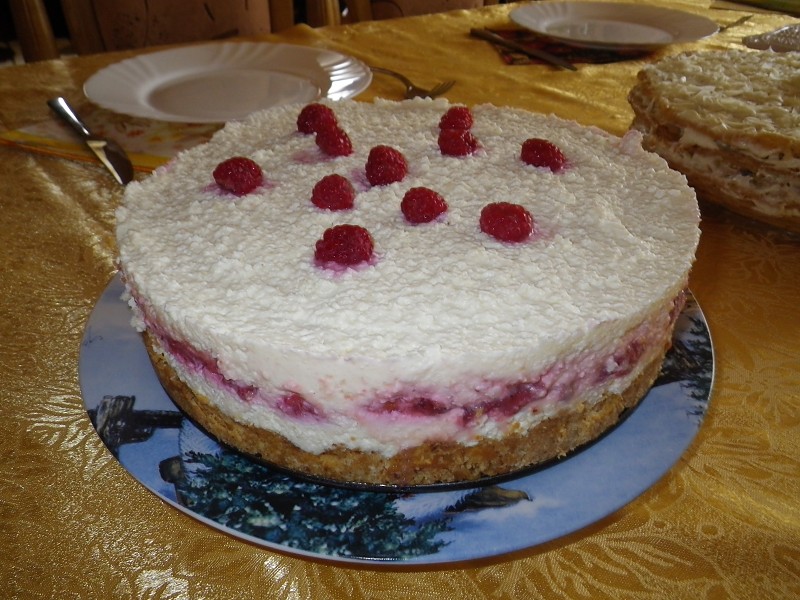 Pusę varškės kremo supilame ant pyrago pagrindo, suberiame avietes (kelias atidedame papuošimui). Supilame likusį kremą, uždengiame maistine plėvele ir dedame nakčiai į šaldytuvą.